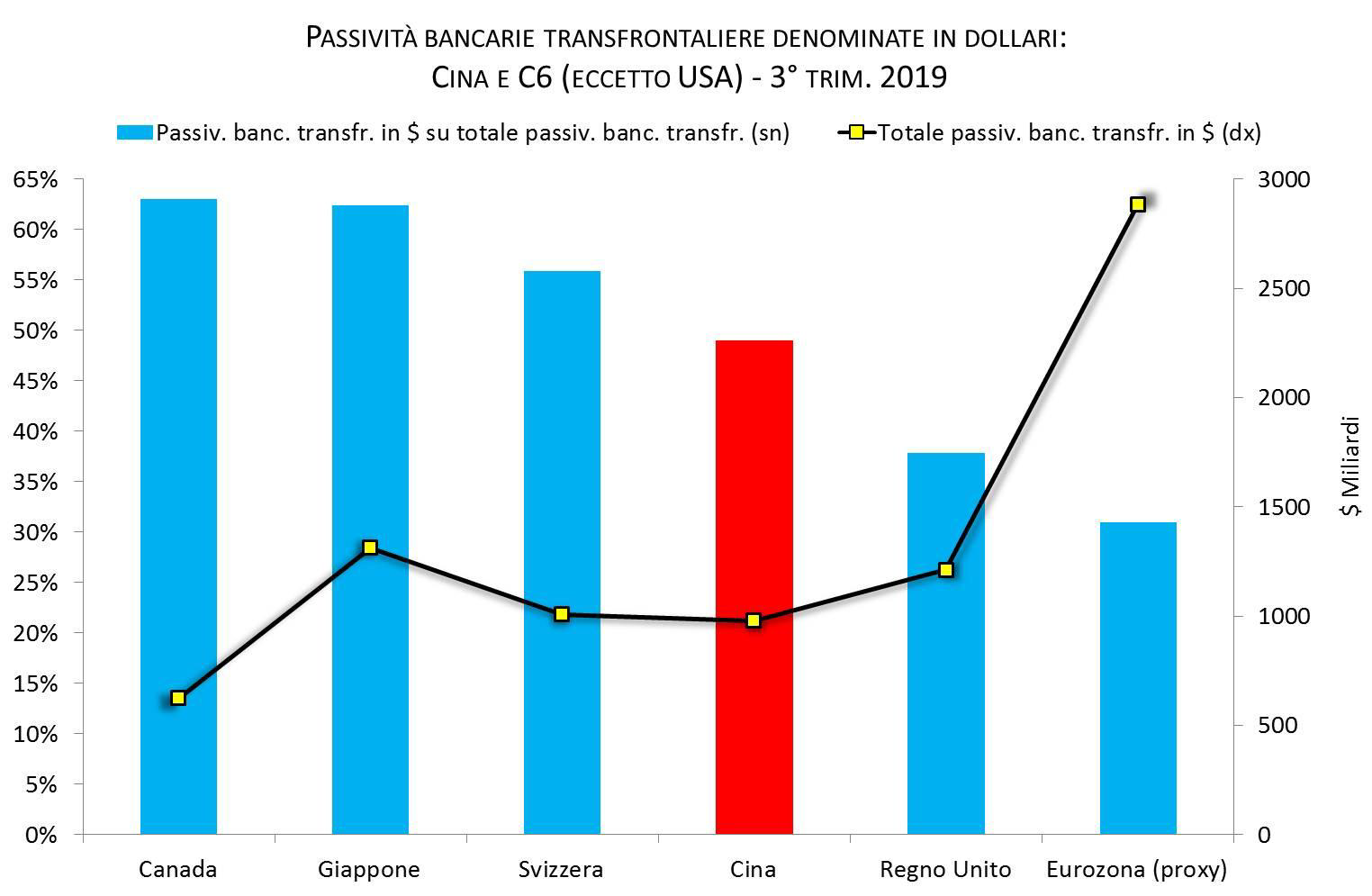 I dati della Banca dei Regolamenti Internazionali (BRI) sulle passività transfrontaliere dei vari sistemi bancari sono chiarissimi. La Cina è la quarta, tra le maggiori aree valutarie del pianeta, le cui banche hanno la più alta incidenza (48%) di passività estere denominate in dollari sul totale delle passività estere. A precederla sono solo il Canada (63%), il Giappone (62%) e la Svizzera (58%), mentre Regno Unito e Eurozona si posizionano al quinto e al sesto posto (rispettivamente con il 38% e il 31%).