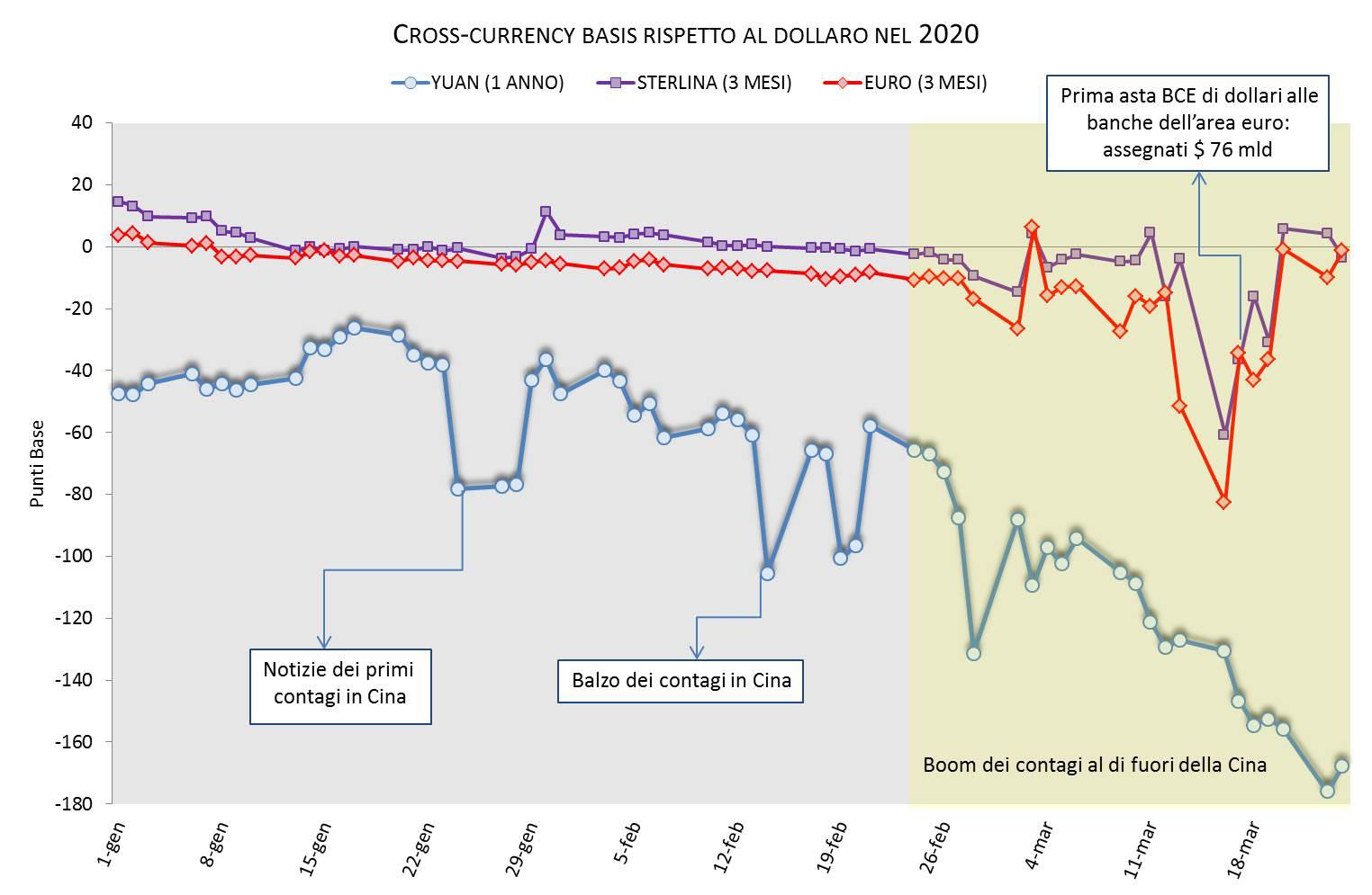 A causa dell’elevatissima incertezza circa l'impatto del contagio del Covid-19 sull'economia globale, della conseguente impennata dell'avversione al rischio degli investitori e degli algoritmi automatici di stop-loss associati alle posizioni nei vari assets finanziari, nelle ultime settimane gli investitori si sono spostati massivamente sulla liquidità, e quindi sui dollari, in tutte le piazze finanziarie. Come conseguenza gli operatori che prestano dollari sui mercati hanno cominciato a chiedere un premio (cross-currency basis) sempre maggiore rispetto a quello implicito nei tassi di cambio a pronti e a termine e nei differenziali di tasso d'interesse.