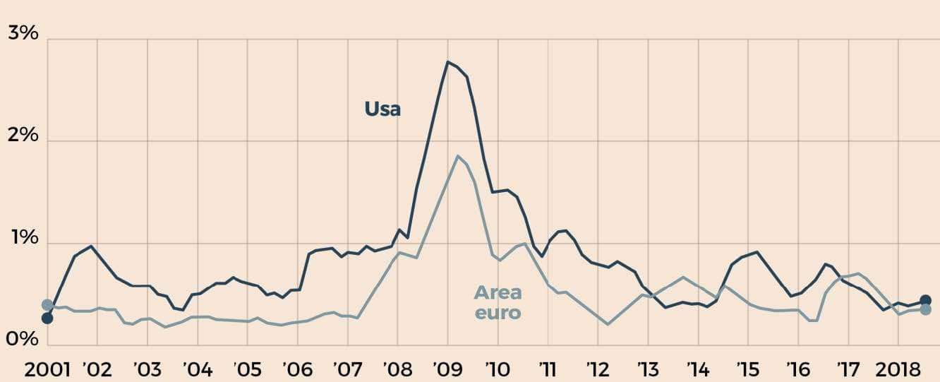 Un certo grado di indeterminatezza sulle modalità di raggiungimento di questa soglia c’è sempre stato, probabilmente voluto per aumentare la flessibilità operativa delle banche centrali. Nel tempo si è consolidata l’interpretazione di un conseguimento tendenziale nel medio periodo, ma solo nel 2016 la Fed – e a ruota nelle ultime settimane la Bce – hanno specificato che l’obiettivo va inteso come simmetrico, cioè raggiungibile anche partendo da tassi di inflazione più elevati, seppure convergenti al 2 per cento. Questi lievi aggiustamenti di tiro sembrano preludere a una ridefinizione dell’obiettivo in senso più lasco; negli Usa c’è un esplicito dibattito intorno al concetto di raggiungimento in media, tale per cui anche periodi prolungati di inflazione al di sopra del 2% sarebbero accettabili se andassero a compensare periodi con una bassa crescita dei prezzi. Parrebbe nel complesso una modalità per elevare la tolleranza all’inflazione delle banche centrali senza modificarne esplicitamente l’obiettivo.