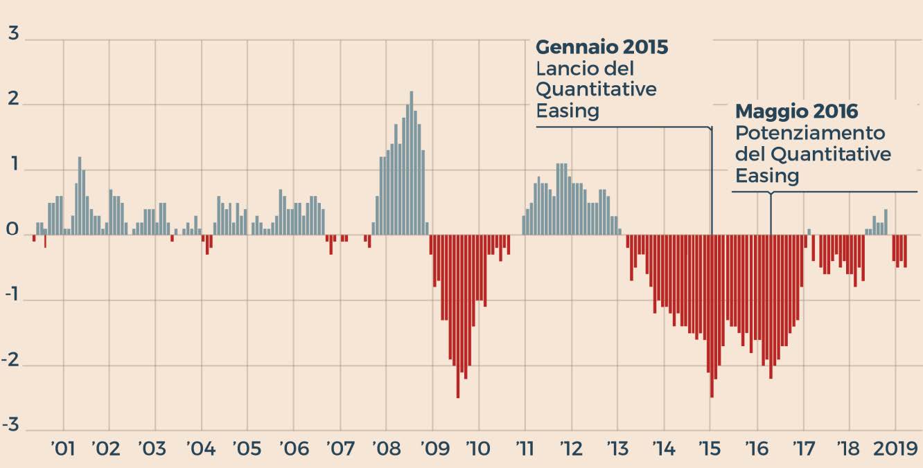 L’INTERVENTO DELLA BANCA CENTRALE EUROPEA Distanza dell'inflazione realizzata dall'obiettivo di inflazione. Dati in percentuale (Fonte: Bce)