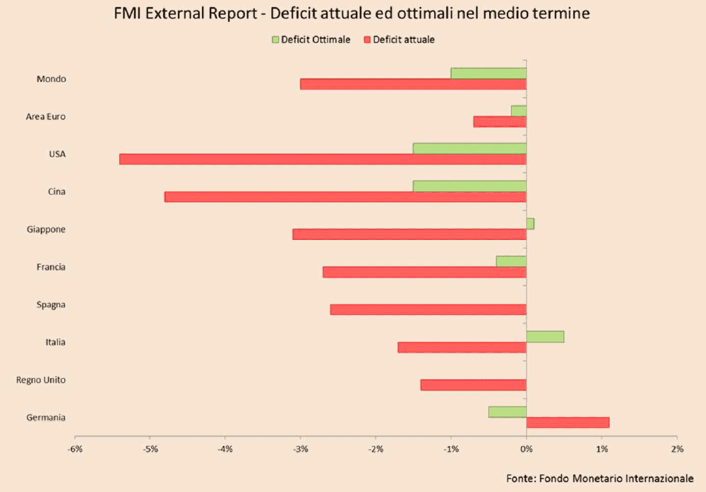 Le ragioni sono molteplici: secondo il FMI in Cina la tendenza ad una crescita del deficit delle partite correnti a causa di politiche fiscali e di stimolo al credito troppo espansive è mascherata dall’impatto negativo di una rete di welfare debole, che riduce la propensione al consumo della classe media. In Giappone sono i bassi investimenti che compensano una politica fiscale eccessivamente lasca; in Italia e Brasile la crescita zero dei prestiti bancari tiene l’economia in stagnazione ed impedisce paradossalmente che i conti con l’estero peggiorino, nonostante i deficit di bilancio ritenuti elevati ed evidenti problemi di competitività dei sistemi manifatturieri.